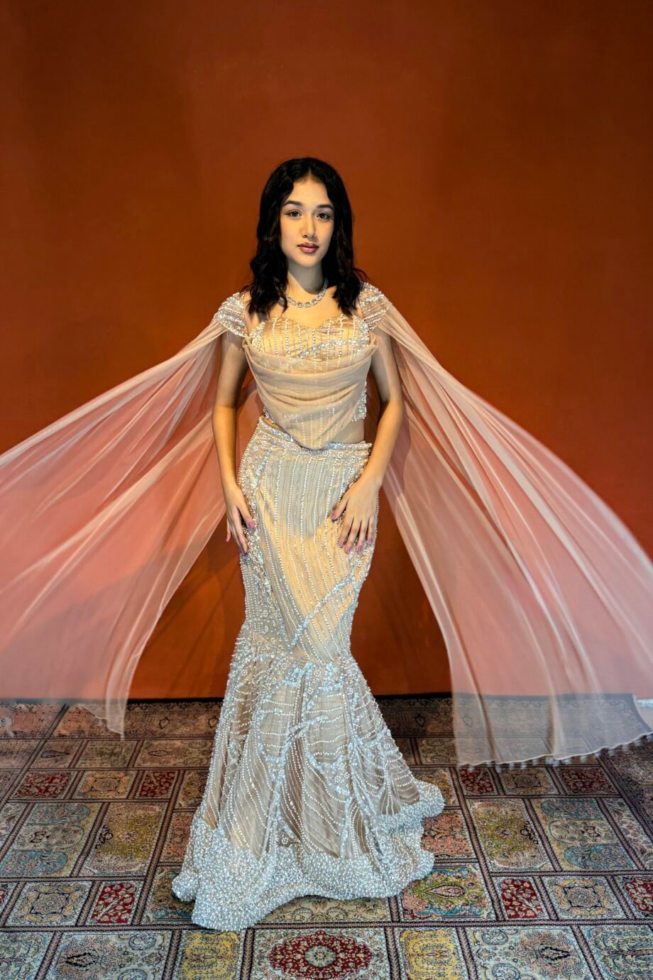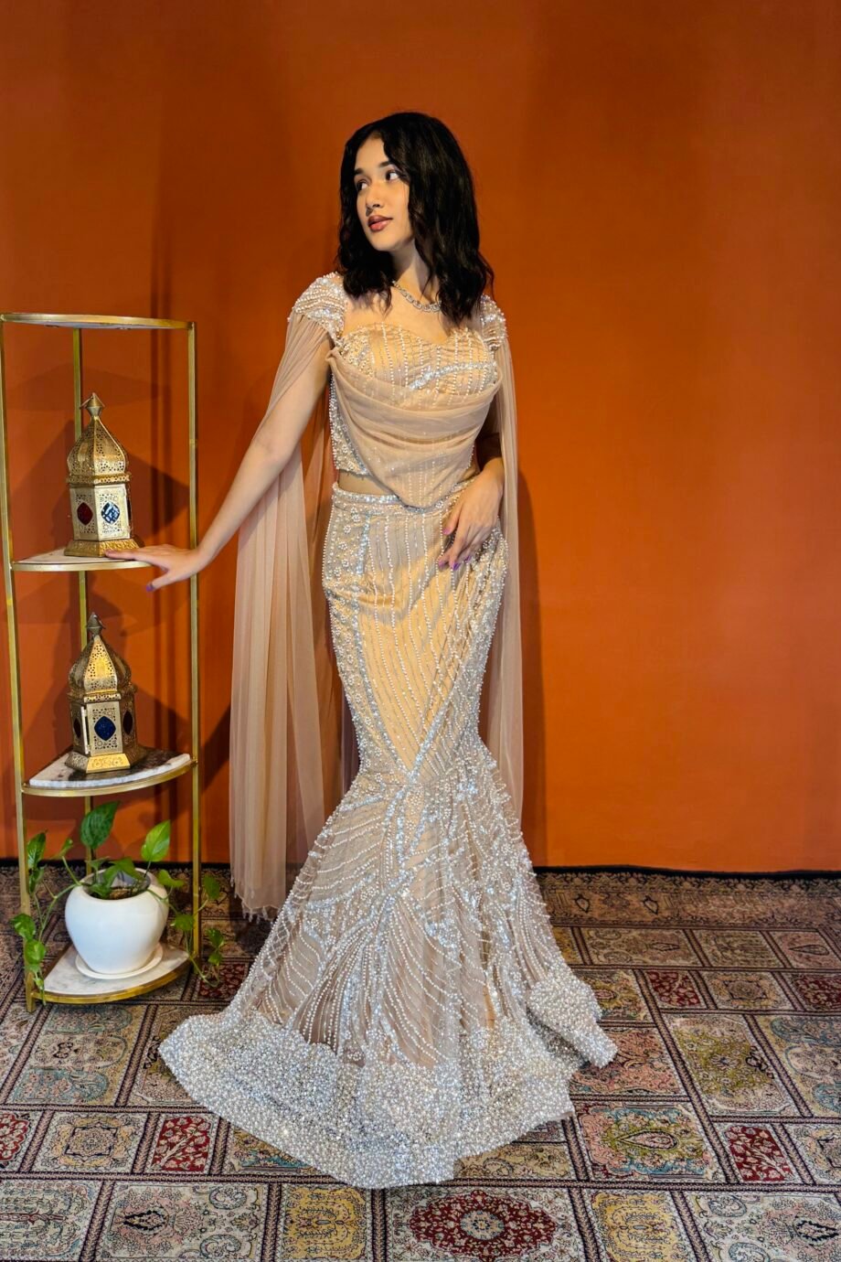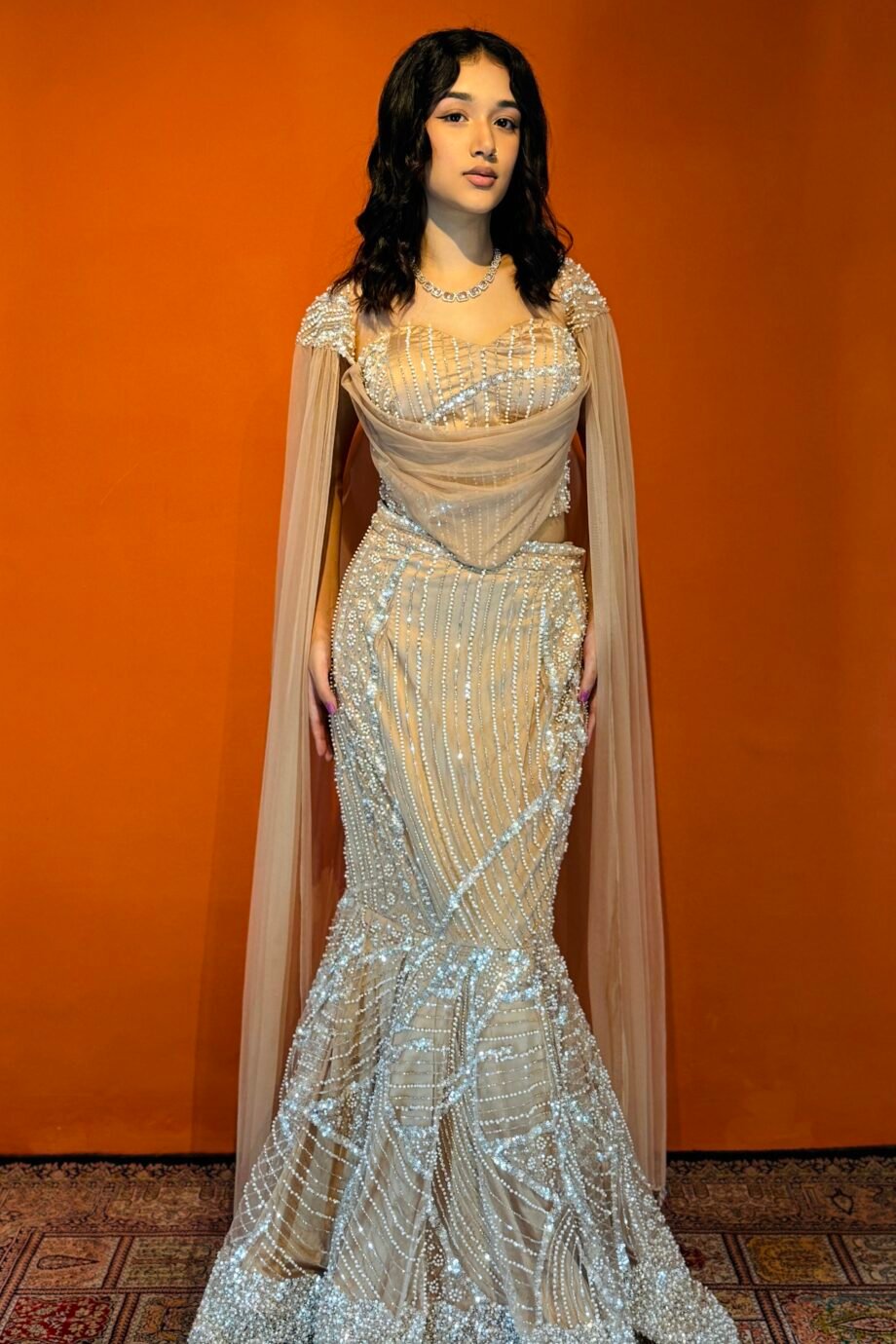 Description: Embroidered Fishcut skirt with capesleeve Corset.