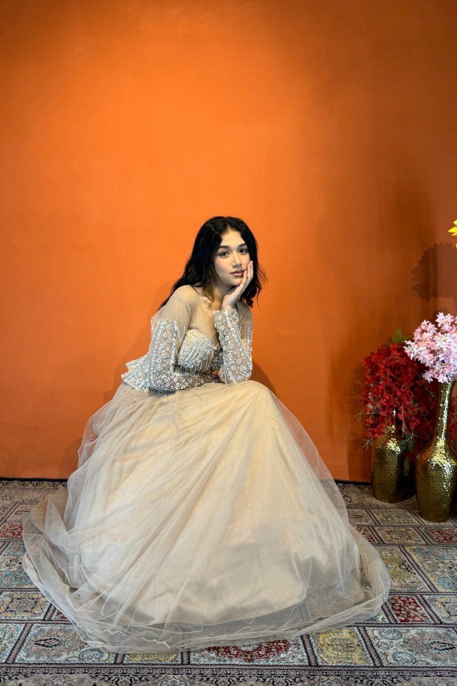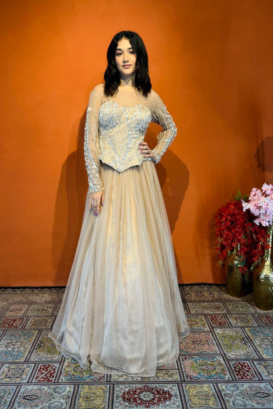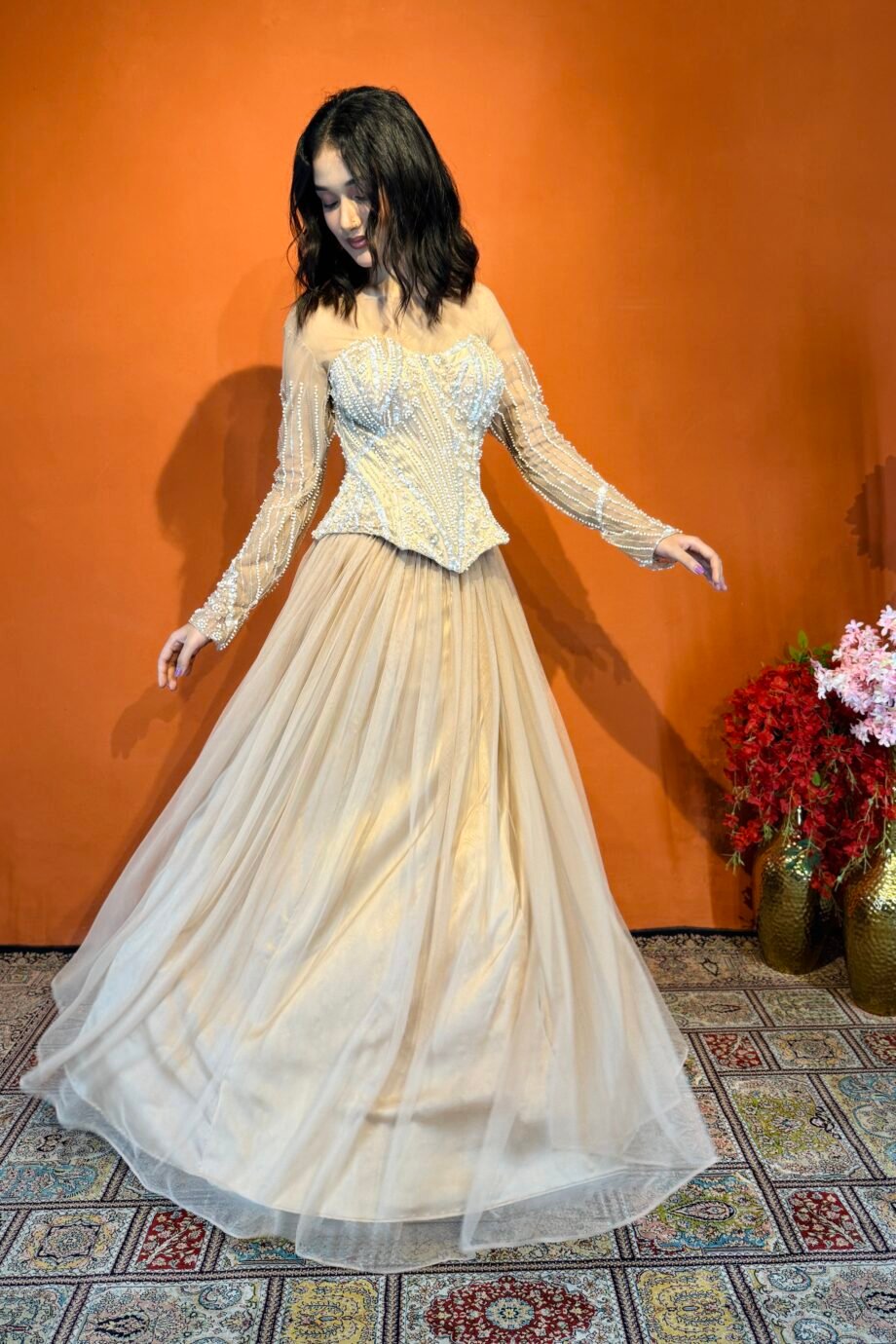 Description: Net Skirt set with Embroidered corset with dupatta.