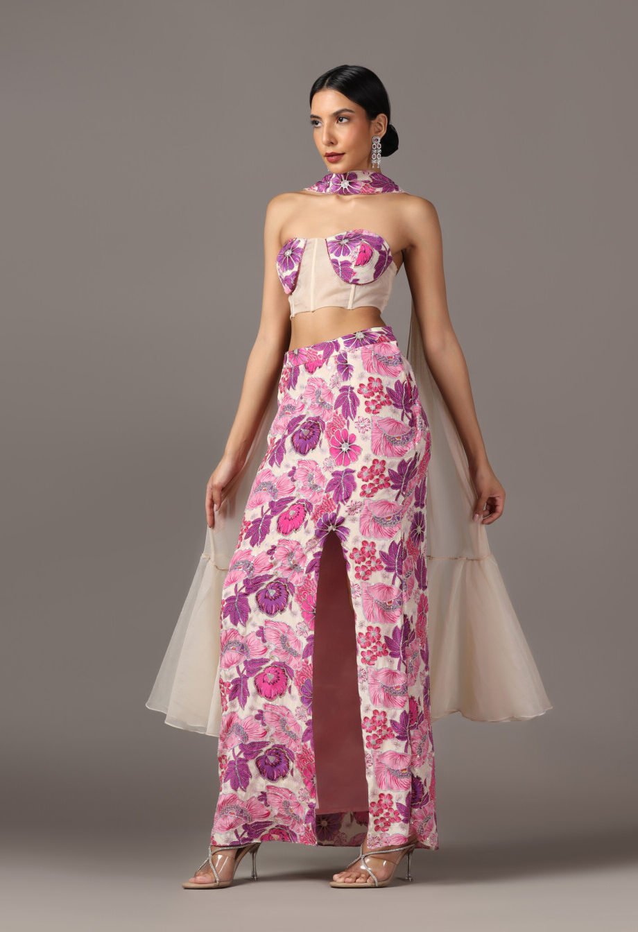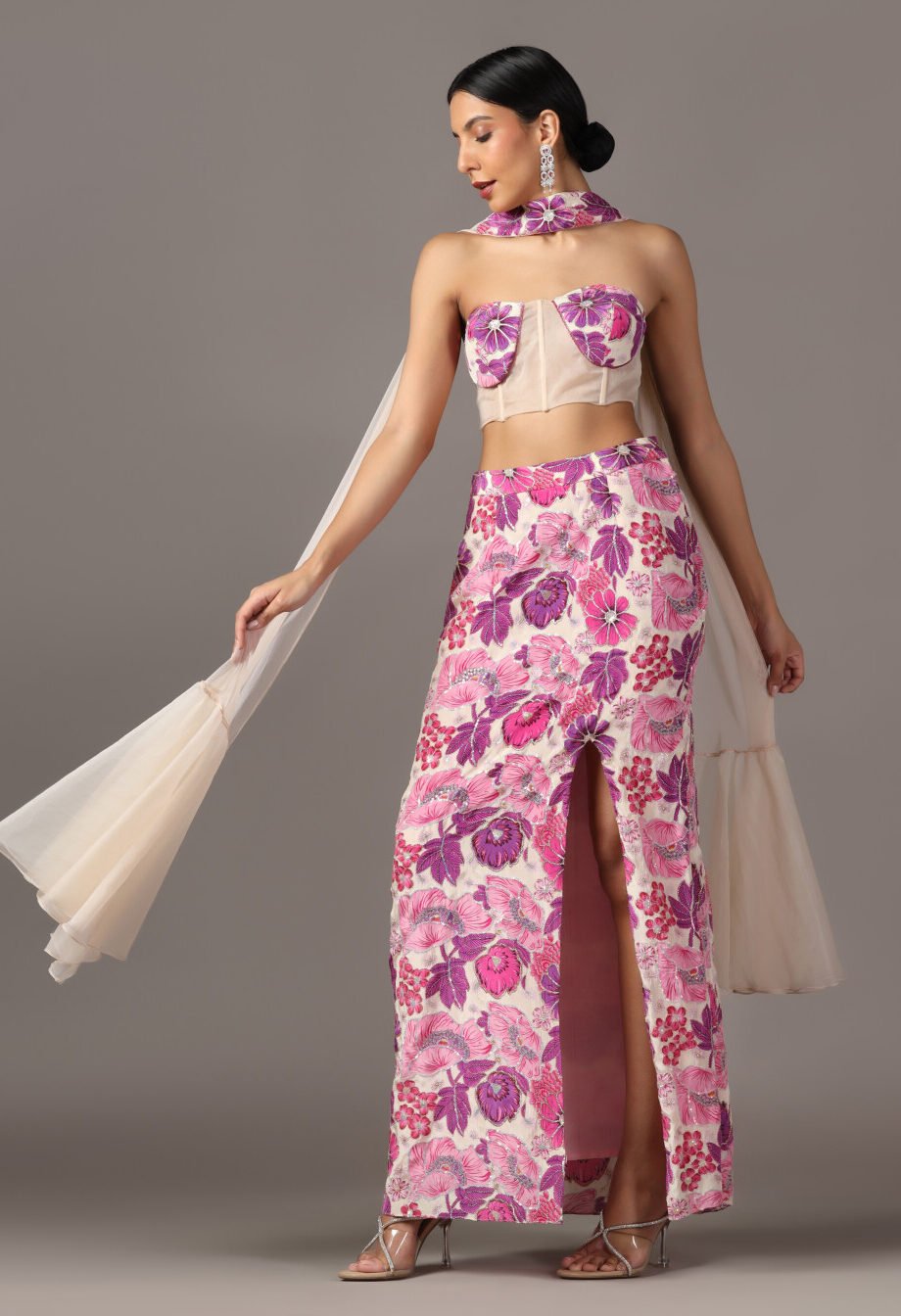 Description:Slitcut skirt with corset and choker Dupatta